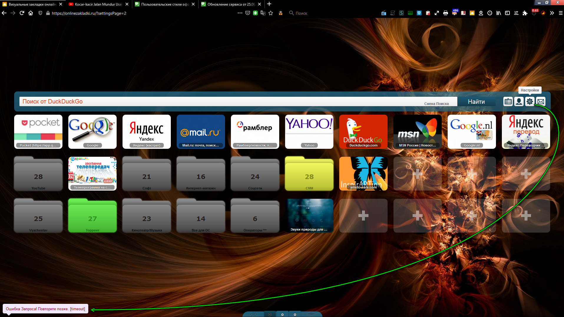 Настройка папок открылась посередине. А вот общие настройки нет… Ошибка запроса. Хотя час назад открывалось.